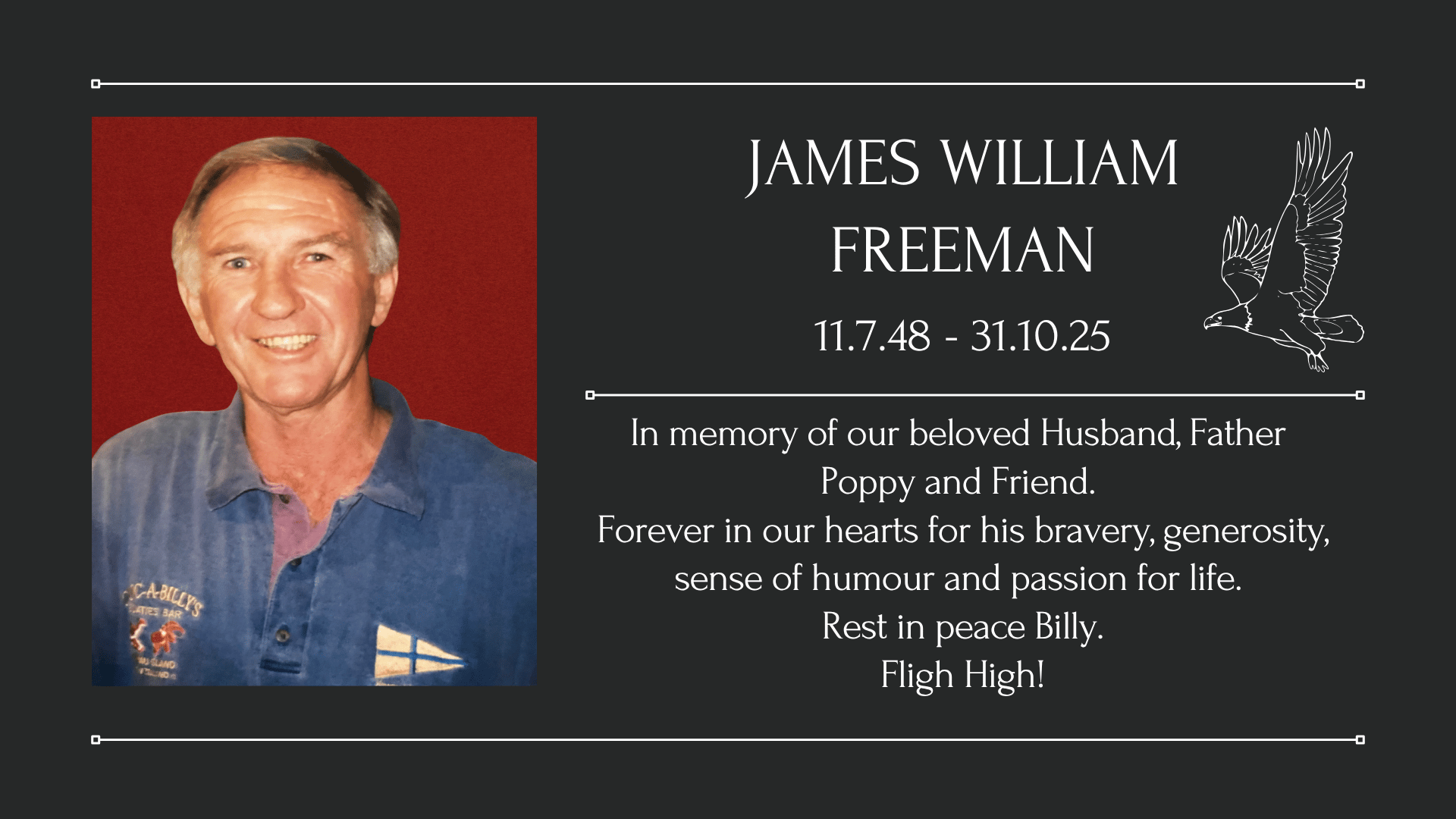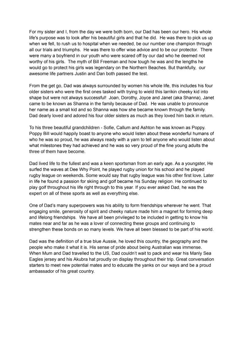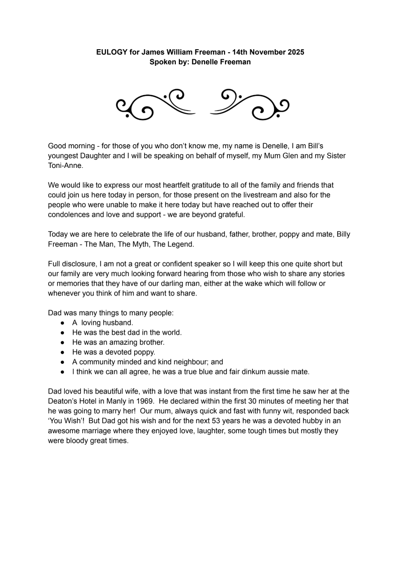 Billy Freeman was the kind of man who made life brighter for everyone around him. Born and raised on Sydney’s Northern Beaches, he grew up with a love for the ocean, footy, golf, good mates, and an easy laugh that could fill a room. Later, he found peace and happiness in Chain Valley Bay, surrounded by family, friends, and the view he loved most — the lake.